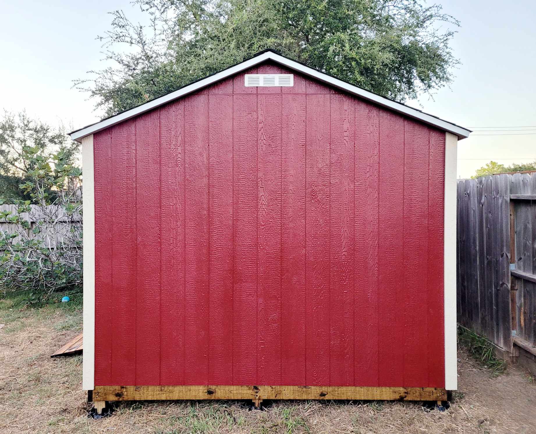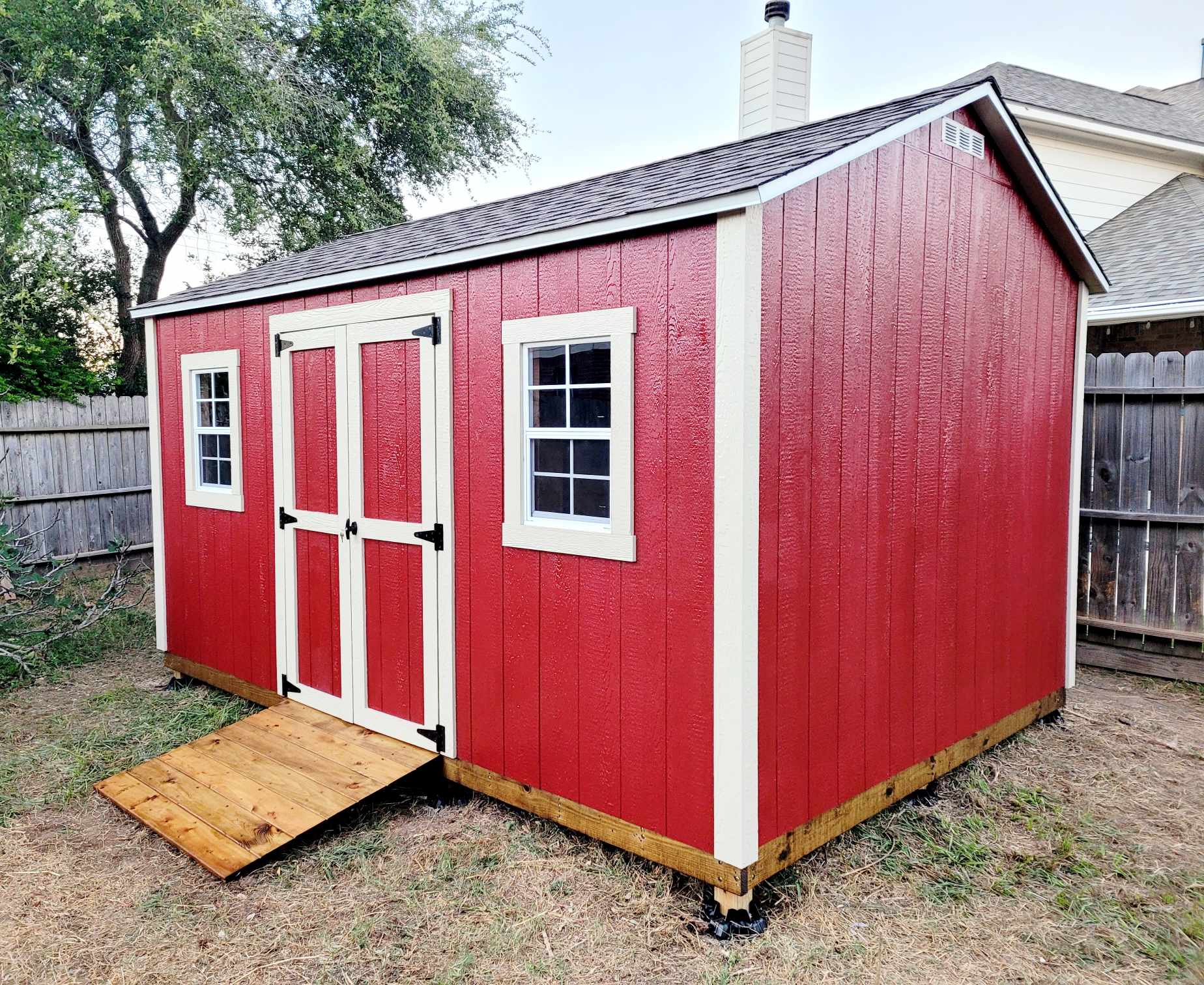 The client who ordered this 10 x 14 in the Riverstone Ranch area opted for a bold red color to match the brick on his home. A very standard build, this shed includes a heavy duty ramp, two 18 x 27 windows and double doors with a 4 ft opening.